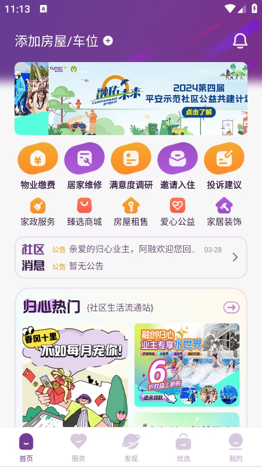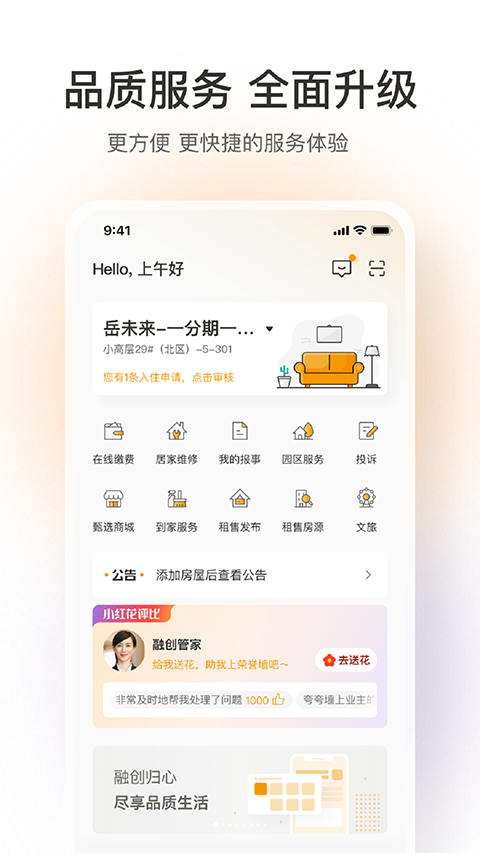 1、在线缴费 手机缴费轻松便捷,抛却繁冗步骤,轻松直达,电子账单环保留痕。 2、在线报事 线上报事,轻松解决生活中的烦恼琐事,为共建美好社区的每一次提醒。 3、社区活动 缤纷多彩的社区活动, 选一个天气与心情美好的日子,让活动为你的美好加buff吧。 4、优选 全新升级,家政服务-家务难题 随叫随到,甄选商城-购物清单 为你一手包办。 5、小红花季 每一朵小红花都是对管家的肯定和鼓励,你和管家的每一次连接都有美好充斥其中,快来分享管家与你的暖心时刻。应用亮点