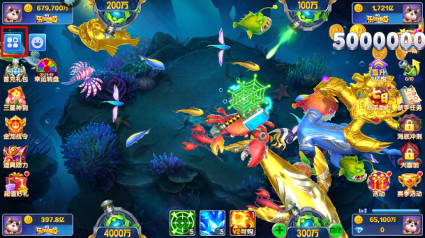 玩家可以点击左上角的四个口,打开“更多页面”,可以使用炮台切换、游戏设置、查看图鉴、切换捕鱼房间、离开房间五个功能。