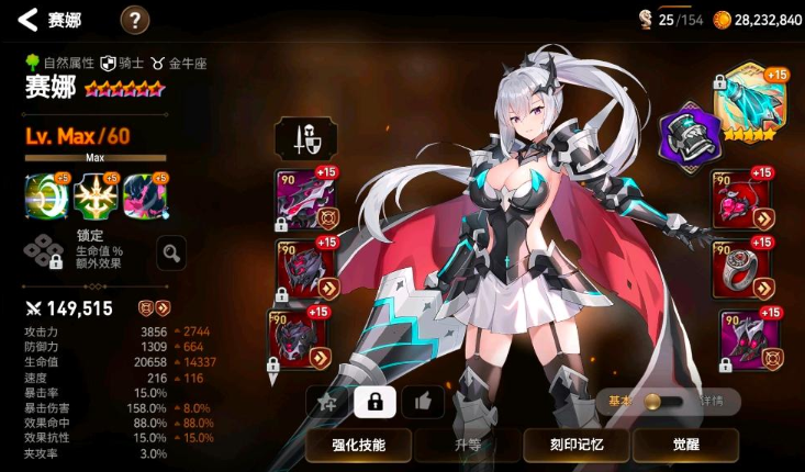 2、推荐装备:赛娜的装备属性优先命中堆到4000左右,剩余的属性可以重点提升血量防御,防守堆命中,打rta的话就重点抗性,打gvg的话就降输出,重点提升提血防。
