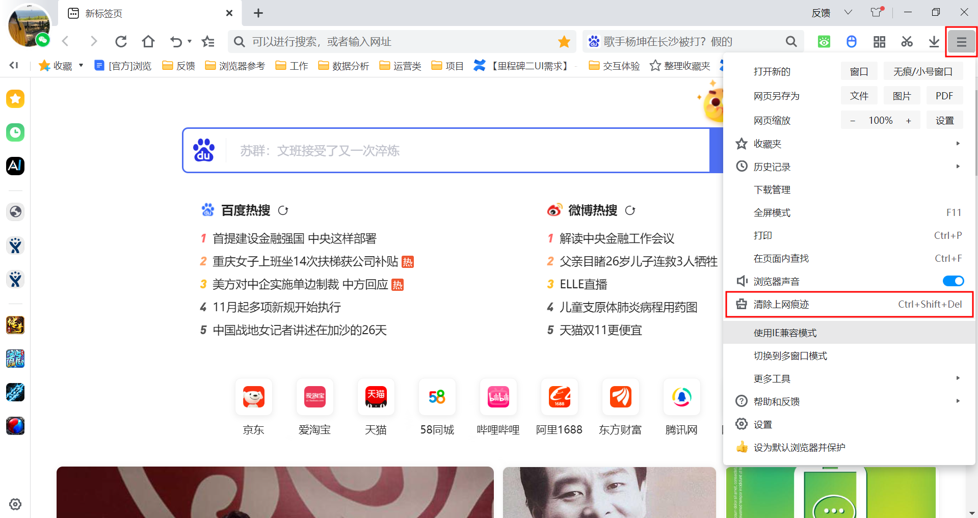 方法一: 网页加载慢,可能是因为临时文件太多导致打开网页速度慢。您可以尝试清理浏览器缓存。具体操作如下: 1、清除上网痕迹功能 (1)点击右上角主菜单,选择清除上网痕迹。