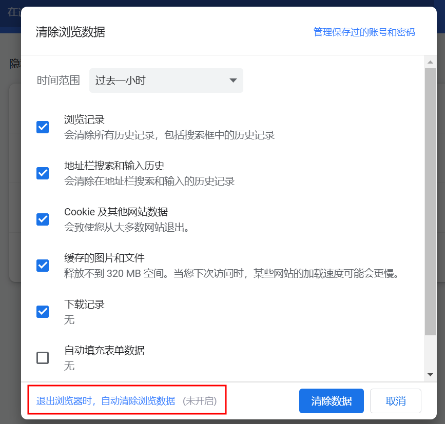 (1)点击清除面板左下角的文字提示“退出浏览器时,自动清除浏览数据”。