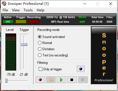 1、MP3,WAV和FLAC格式 提供各种设置,包括比特率,采样率,单声道,立体声等 2、独家双重录音选项 双重录制选项允许同时录制为WAV和MP3文件格式 也可以录制未经过滤的RAW未触动WAV文件以及经过过滤和压缩的MP3文件 3、听写模式 一种特殊的录音模式,其中所有声音激活的录音都收集到一个文件中 在选定的时间过去之后,自动保存功能将保存记录 将自动保存设置为30分钟将在第一次触发发生30分钟后生成一个文件 自动保存设置为30分钟,每小时最多可生成两个文件 4、音调触发 设置Snooper以按特定频率触发录制,使用TwoToneSequential模式可触发公共寻呼机或控制系统使用的常见音频音调,甚至有可能触发一系列DTMF音调 5、文件分割器 在预定义的文件大小或持续时间后,记录可以自动拆分和保存 6、热键 可以设置系统范围内的用户定义热键来控制程序 当切换到屏幕锁定或从屏幕锁定切换时,也可以将记录设置为自动开始/停止 7、加密 录制完成后,Snooper可以自动对录制的声音文件进行加密,通过邮件或FTP通过Internet传输录音时很有用 8、自动增益控制 AGC会将输入声级调整为最佳值,从而产生一致的输出幅度,结合使用噪音消除系统,可以轻松录制低振幅的声音 9、声压计/记录仪 使用内置的SPL计监测声压级24/7 使用内置的查看器以图形方式查看测得的声音/噪音水平 在图表中,您可以看到参数Lmax,Lmin,Lpeak和Leq,它们提供了一种非常有用的描述声级的方法 可以搜索振幅数据并将其导出为MS Excel兼容格式,以进行进一步分析 10、数字滤波器 可调数字滤波器可以应用于音频录制 这可用于衰减音频记录中不需要的信号或噪声 11、频率分析仪 内置的实时频率分析仪显示输入声音信号的详细图片 12、触发事件 触发声音发生时播放声音或启动外部程序 通过电子邮件发送后删除文件,将文件复制到备份存储,数据库,FTP等常见问题