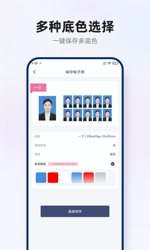 【智能算法】 采用先进的人工智能人脸识别算法,保证您证件照的成像质量,可以根据拍摄照片的不同场景精准化扣图人像照片,更大限度减少人像边缘模糊的情况。 【自然美颜】 专业的美颜工具,自动对照片人像进行磨皮,美白等操作,制作自然好看的证件照,保证照片不失真。 【超多尺寸】 针对不同使用场景,分类多款证件照尺寸可选,还可以直接搜索查找想使用的场景。 【精美正装】 多套精美的男装、女装、童装随意挑选,自己拍也要拍出正式感!智能证件照拍摄App使用教程