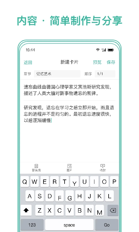 可以把知识编辑成卡片,目前支持文字、图片、声音。 可以把自己的知识卡片分享给朋友,也可以搜索他人的卡片进行学习。 可以把知识卡片加入记忆规划,墨墨记忆卡会为你安排合适的时间进行复习。 可以查看自己的记忆数据:遗忘曲线、记忆持久度、每日学习情况。 可以每日签到,见证自己的坚持和成长。墨墨记忆卡APP使用说明