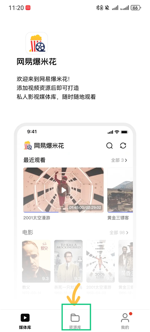 1、需在网易爆米花手机端添加资源,电脑端将自动同步。 点击前往下载网易爆米花手机端,打开后,点击【资源库】。
