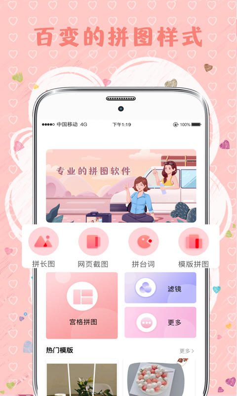 1、精美的模板:打破拼图的静态边界,混合多次剪切的特殊效果,免费伴奏,并充分调动感官体验 2、简约模板:主要是文学和艺术的空白,增强个人风格 3、便签模板:让文本和照片合并为一个,使照片更具特色 4、无缝模板:无缝拼接照片,经典照片效果演示 5、锁屏模板:创建自己的手机壁纸 6、封面模板:宣告您很酷的标题生活,并且不断更新的样式使您每天都能分享新照片更新日志