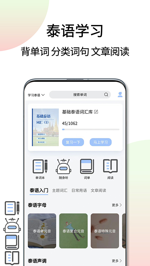 1、文本翻译:中文、英文、泰文文字智能识别翻译 2、语音翻译:智能语音识别、语音对讲翻译 3、图片识别:拍照、上传图片智能扫描识别文字翻译 4、泰语词库:泰语有声双语词库学习,符合人类遗忘曲线规律的智能学习模式 5、泰语词汇:泰语字母、主题词汇等有声学习 6、日常用语:不同场景下日常用语的学习和使用 7、随身听:词库、主题词汇、日常用语等都支持加入随身听播放列表 8、文章阅读:新增有声泰语会话、有声泰文阅读等有声文章,泰语基础、泰语进阶、走进泰国等专栏文章更新日志