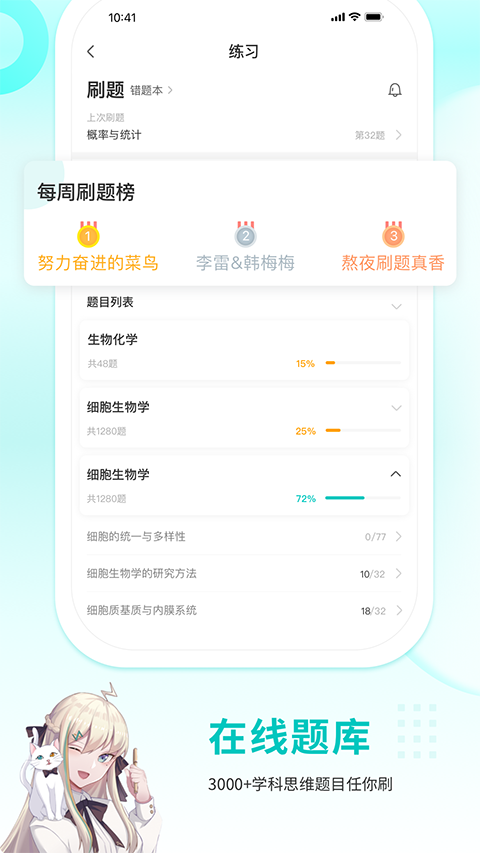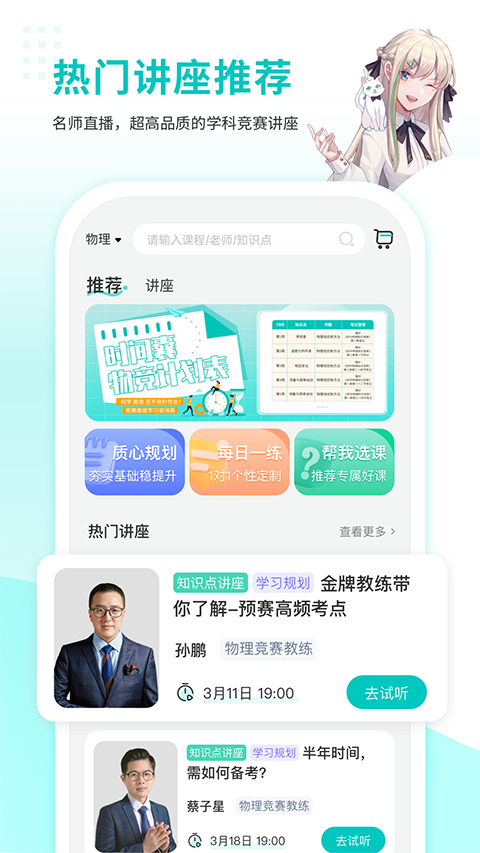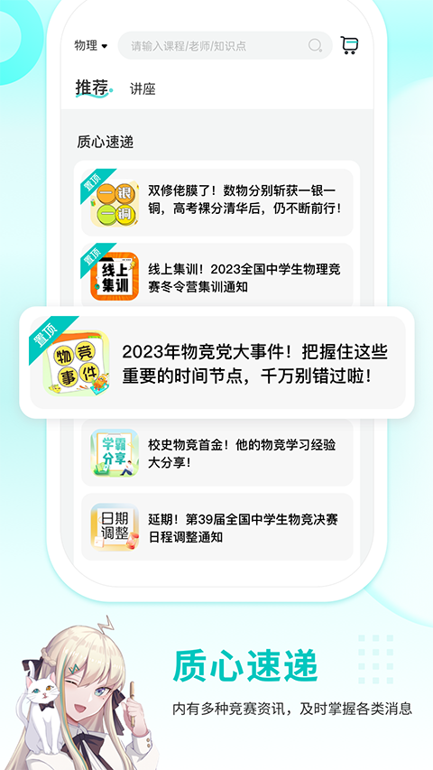 1、多学科竞赛资源:现已上线物理、生物、化学、数学四个学科,每周都有配套的免费竞赛讲座,帮助学生深入了解各个学科的竞赛知识和技巧。 2、知识点视频:特邀蔡子星、孙鹏等名师,以短视频形式精讲各学科核心知识点,让复杂的知识变得简单易懂,帮助学生快速掌握竞赛要点。 3、质心直播课:课程大纲模块化设计,满足各个阶段学生的学习需求。我们提供刷题班、考前冲刺班等特色直播课程,助力学生攻克竞赛难题。 4、免费题库:海量经典题目,学生可无限刷题。同时,学生可以随时查看刷题量和正确率,以便更好地评估自己的学习状况。 5、在线测试:备受好评的U/G系列模拟试卷,全国竞赛学生广泛参与,帮助学生检验自己的学习成果和水平。 6、资料下载:提供全面的竞赛资料,包括讲义、练习册、试卷&解析、思维导图以及专属知识手册等,方便学生随时下载学习。软件优势