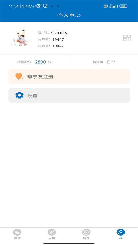 5、点开我的,可以查看昵称、用户名、核信号等等。
