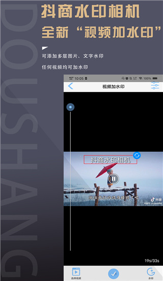 1、我们首先下载抖商水印相机APP。 2、打开软件,点击“视频加水印”功能。 3、点击左下角,选择“已有视频”选项。 4、进入选择视频页面,选择要加水印的视频。 5、点击右下角按钮,再选中“添加文字”选项。更新日志