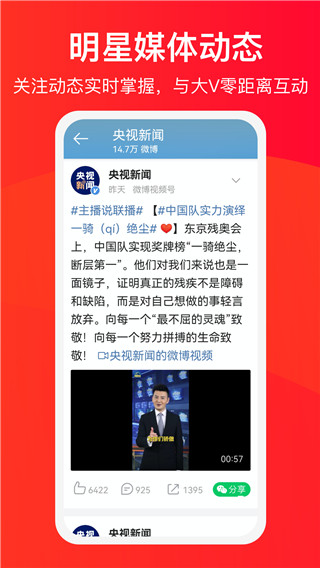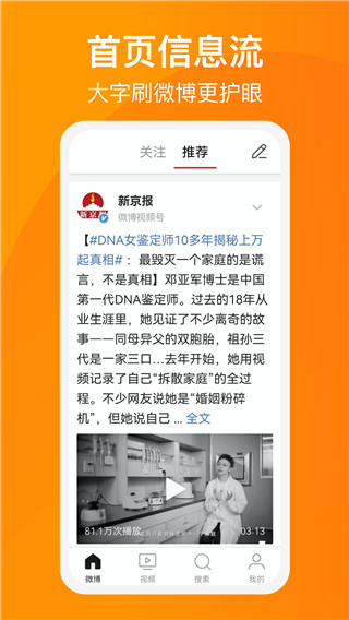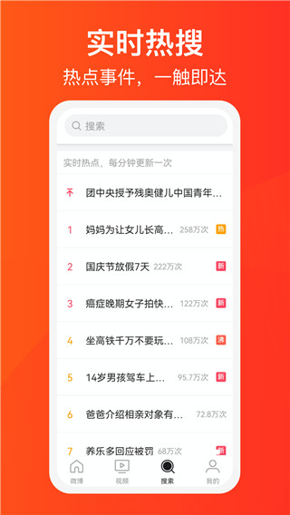 1、首页信息流,大字刷微博,更护眼,还可以随意设置。 2、海量视频,高清视频,精彩内容让你看个不停。 3、实时热搜,热点事件,一触即达,每天都精彩。 4、热点内容迅速捕捉,推荐给你最感兴趣的内容。 5、呈现最新鲜、最热门的热点,想知道正在发生什么,来看热搜榜。功能介绍