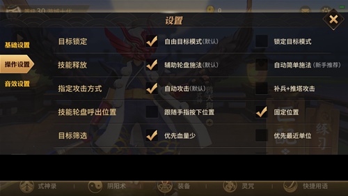 指定攻击方式,这个可以根据玩家的操作习惯来决定,很多人会把补兵和推塔攻击勾选出来,这样你在塔下的时候点击推塔,式神就只会优先攻击防御塔,而自动攻击则是优先攻击敌方式神或是小兵。