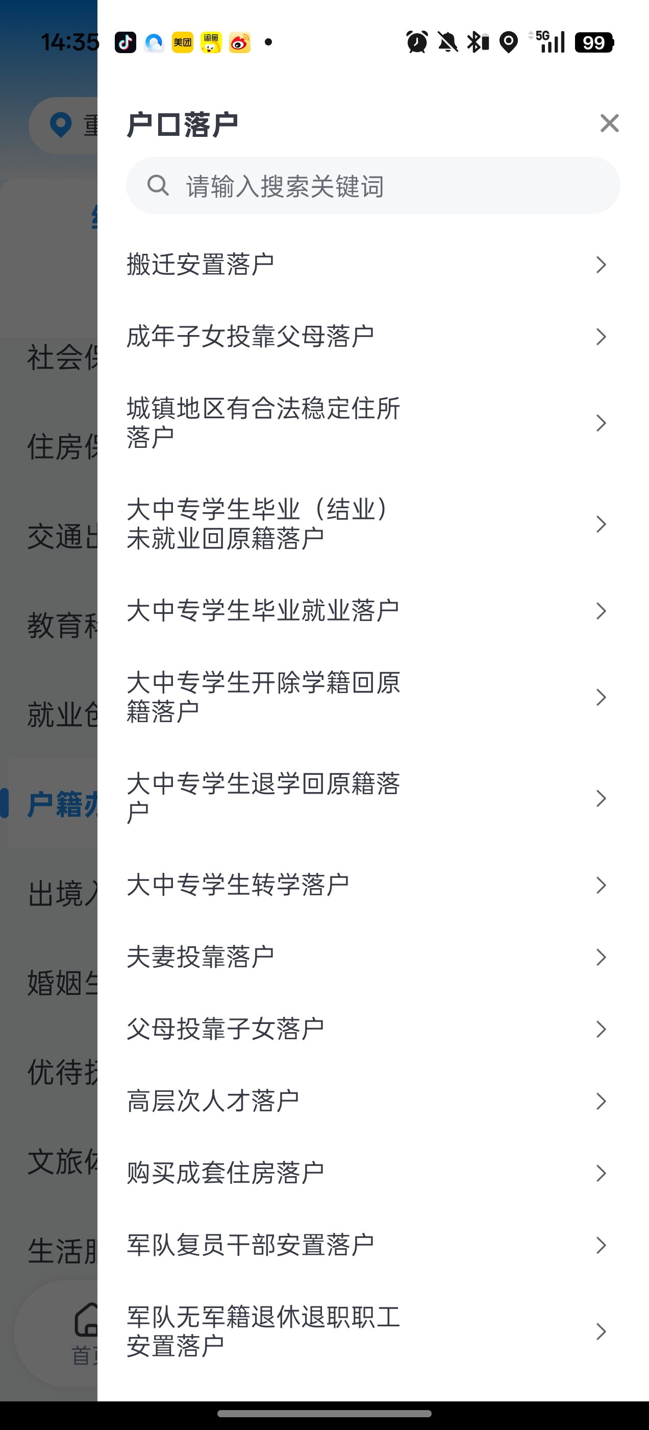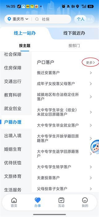 3、以“户口落户为例,”点击屏幕右侧“户口落户”的“更多”。