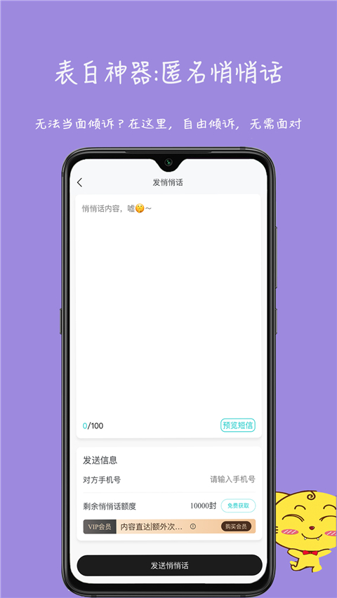1、给未来的自己写封信 写信给未来的自己,让现在与未来不期而遇。 2、给情人写一封信 用书信的方式向她表达你的爱,留下你们最极致的美好 3、树洞 一个匿名秘密分享平台,在这里可以寄存你的秘密、内心纠结以及对他人的祝愿等,它将分享给每个路过的有缘人。 4、悄悄话 一个完全匿名的社交应用,你可以通过私信方式与朋友发送文字信息、图片分享;另外对方不需要下载未来信封就可以收到哦。 5、笔友在这里 您可以留下自己的写信地址或者寻找别人的地址,按照城市,年龄或者兴趣爱好找到能与您做笔友的人,然后您就可以写信过去。您也可以留下自己的地址并附上一段个人介绍,然后就等着您的笔友来寻找您吧。愿你一生终有所遇,不负归期。软件亮点
