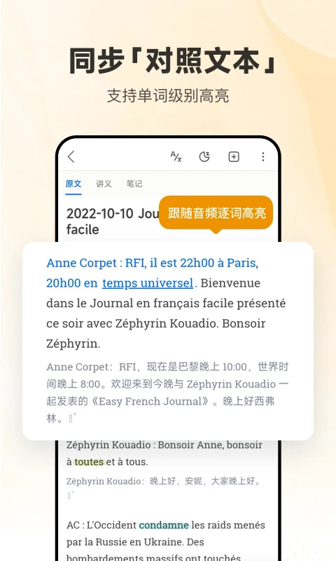 想要阅读法语原文,却总被生词绊住脚?打开词典查词浪费时间又麻烦,查过的单词总是记了又忘?别担心,每日法语听力帮你简化查词流程,加深单词记忆,让学习更加便利。 1、长按查词 每日法语听力与法语助手无缝集成,听读文章时,遇到不认识的单词,只需长按单词,即可查询释义,法语学习更加便利。