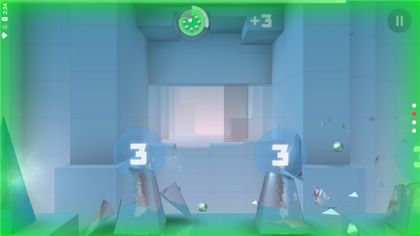 3、在游戏中出现标记的绿色球形的物体时,你只要用弹球击中后你的弹球数量就进入了无限模式,你可以无限制的发射导弹攻击,这样就可以尽可能容易的击破障碍。