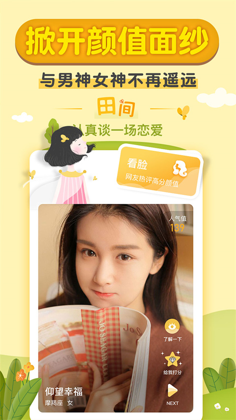 心动交友:左滑无感、右滑喜欢,互相喜欢即配对聊天。让你轻松接触男神,想聊就聊! 态度投票:这里是表达自我,泾渭分明的田地。花样晒图、话题聊天,交朋友。 许愿社区:种下心愿,串起美好。丰富的个人主页,资料、照片、交友需求、动态,比朋友圈更有看头! 真实资料:真实手机号注册,在线用户实时更新,同城交友,快速见面约会!更新日志
