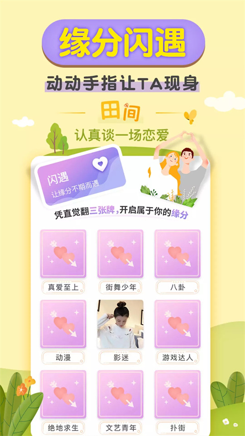 【闪遇】拼缘分交友,提供线上沟通交友方式,可发布动态,在线聊天;相互选择心动单身男女,找到恋爱交友对象,让你即刻脱单;找到志趣相投知己 【看脸】零距离接触帅哥美女,成熟男女交友平台,联系心仪的单身异性,并且可查看近在身边可约会、可聊天、可约会、可面对面约聊的单身异性 【距离】同城在线找对象、交友约会约聊平台专为单身汪打造的脱单密器 【恋爱攻略】提供实用的恋爱交友技巧,开场白、约会邀请、恋情经营则不再是难事。同城交友,探探身边的单身男女,遇见你的爱 【情感测验】认识与发现自我的一面明镜,让你立即和有缘人相匹配畅快密聊、聊天、约聊,面对面约会。附近秒约拥有高颜值的软件特色