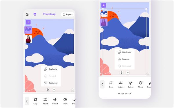 1、将其作为图层导入 在主编辑屏幕中,您会在左上角的主页按钮旁边看到图层图标。点击它,选择紫色加号按钮,然后点击“导入”。 导入的背景将弹出之前的背景去除图像。如果它不符合照片的比例,请点击并拖动角以进行相应调整。