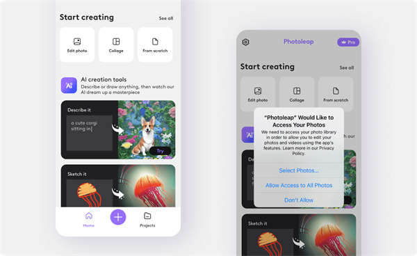 1、打开你的照片 您可以通过以下两种方式之一打开之前拍摄的照片。使用屏幕顶部的“编辑照片”按钮或底部的大紫色加号。 弹出窗口将询问Photoleap是否可以访问您的照片。在点击您选择的图像之前,选择“允许访问所有照片”。