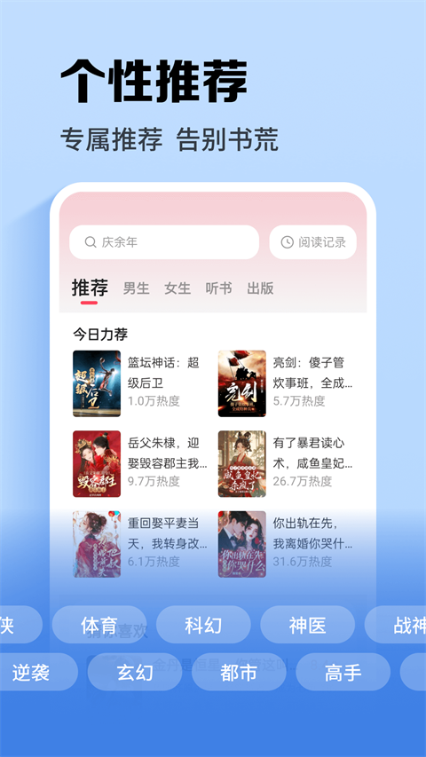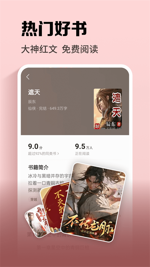 1、智能推荐:大数据智能推荐用户喜欢的书籍,打造个性化阅读体验 2、海量书库:超50万册正版图书,25万集听书,10万集漫画 3、精美排版:百人团队精心校对排版,超优阅读体验让您手不释卷 4、离线阅读:wifi传书,支持TXT、EPUB等多种手机阅读格式软件优势