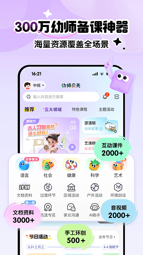 1、多元体系课程:幼师贝壳App根据小、中、大不同年龄段发展特点设计的高质互动课件1000+,涵盖幼儿园高频活动主题,同时提供安全教育、24节气、幼小衔接等特色体系课程,实时紧跟热点,持续更新内容,满足老师五大领域教学所需; 2、海量电子素材:海量高清精品图谱,环创手工、纸面教具、调查表、海报、奖状、手指操、动画、古诗等素材,助力老师轻松备课; 3、轻松获取资源:关键热词随时搜索,一秒获取主题相关资源; 4、多端实时共享:资源课件可在电脑端、手机端、电视端实现数据同步,随时随地查看课件内容,多端协作更方便; 5、家园共育工具:通过“小程序+微信群”的模式为老师和家长提供通知接龙、相册共享等全场景服务,提升家园信息沟通效率。软件功能