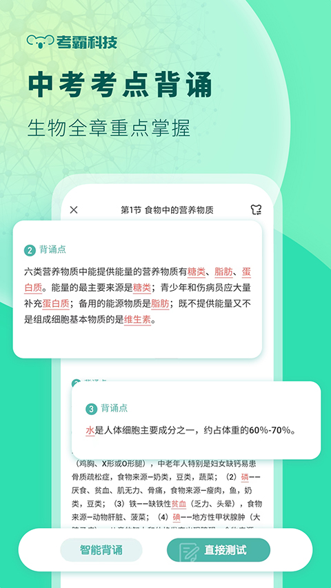 1、【全科同步教辅资料】 同步跟进课堂进度,按照孩子课前预习课后巩固,同步整理全科知识点背诵,初中生物课堂重点、难点、要点统统拿下,家长无需为孩子课后复习担忧,打开背诵模式,轻松get所有知识点,学习好玩又简单! 2、【千万级题库标准】 考霸科技智能题库,老师们的优质选择,孩子们复习巩固的品质保障;题库智能总结章节重点,考试难点,历年常考等几大类题型,更结合闯关模式,游戏式做题让孩子爱上学习,爱上刷题~ 3、【智能辅助工具】 智能搭配,复习不累!智能总结错题归纳,量身定制个人笔记本,错题、难题统统归纳清晰,更有助于考前刷题,拿下重点,不让错题一错再错!软件功能
