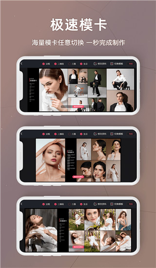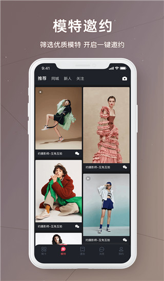 - 极速模卡:选择任意6-12张图片制作模卡 - 视频模卡:让模卡动起来吧 - 进模特群:快来买萌群里热闹喽 - 模特约单:让我们约起来 - 简易通告:简易通告迅速找到她/他