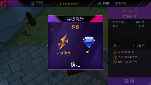4、完成任务后获得金币,等级升级还可以获得体力、和钻石,点击继续弹出界面。