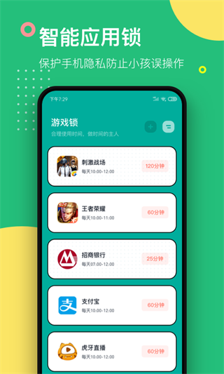 游戏锁app官方正版是一款能够帮助用户锁住手机中所有应用的手机工具。随着信息时代的高速崛起,互联网的全面普及,现在家家户户都会使用到各种网络工具,网络也是一把双刃剑,它能帮助人们收获更多快乐,学习更多的知识,而并不是你用来玩乐的工具,现在许多年轻的用户们对游戏的瘾越来越严重,所以小编给大家带来这款游戏锁app。这里拥有非常多的功能,用户使用这款软件可以自由设置游戏或应用的锁定时间,防止沉迷手机游戏,帮助自己能够养成更好的习惯,有节制地实用时间,帮助自己更好的集中精神学习作业,工作阅读,减少对手机的依赖性,感兴趣的用户们快来下载吧!