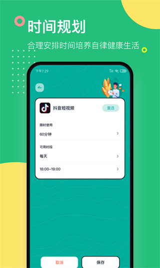 3、锁定设置:自由设定应用使用时长与时段自由,操作便捷,同时拥有智能解锁,不会阻断正常或紧急情况下应用的使用,可以放心使用。