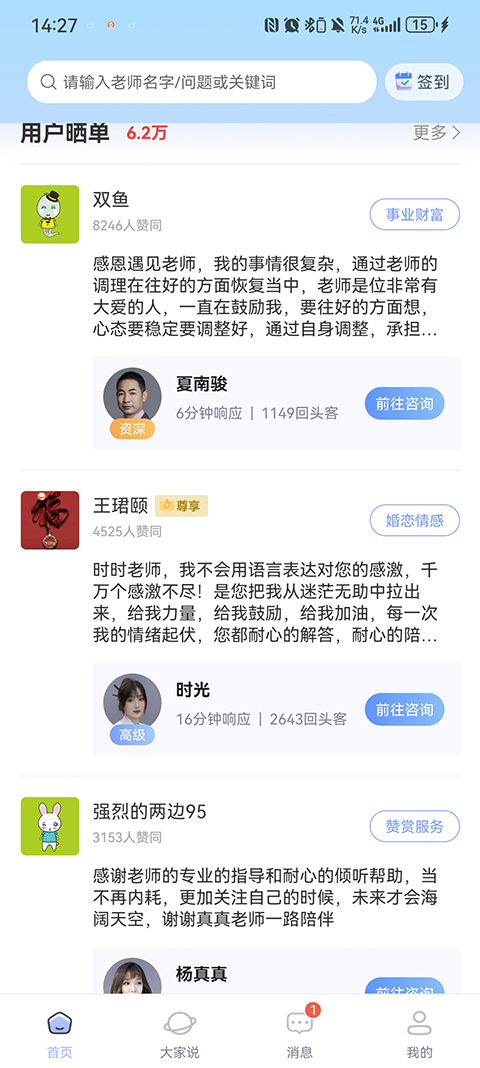 1、真人老师1V1-咨询时效长 全程真人老师1V1深度咨询,咨询有效期高达5天! 2、已运营10年-师资团队强 过百位通过分析10年服务数据严格筛选而来的真人老师团队,累计已为过百万用户提供深度咨询服务,真人老师筛选过程中必须同时满足专业能力强、响应速度快、服务态度好、回头客多等条件,方可为您提供服务! 3、无忧式服务-咨询有保障 高人汇在为您提供专业且深度的婚姻情感、事业财富、心理健康等咨询服务的同时,特别提供资金担保——未服务可即时退款,真正让您感受无忧一站式咨询服务高人汇咨询app怎么用