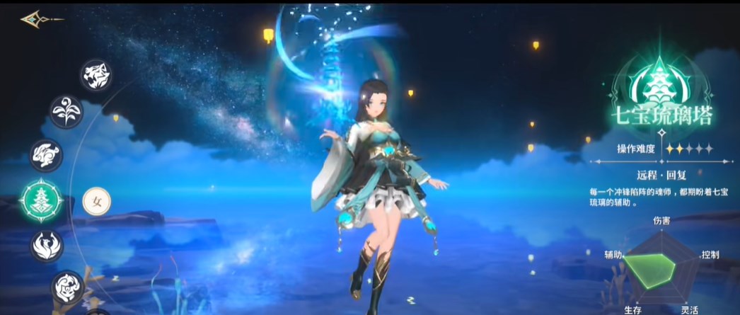 3、七宝琉璃塔,属于辅助角色,可以带来群体治疗和部分属性增益效果,同时还能复活队友。