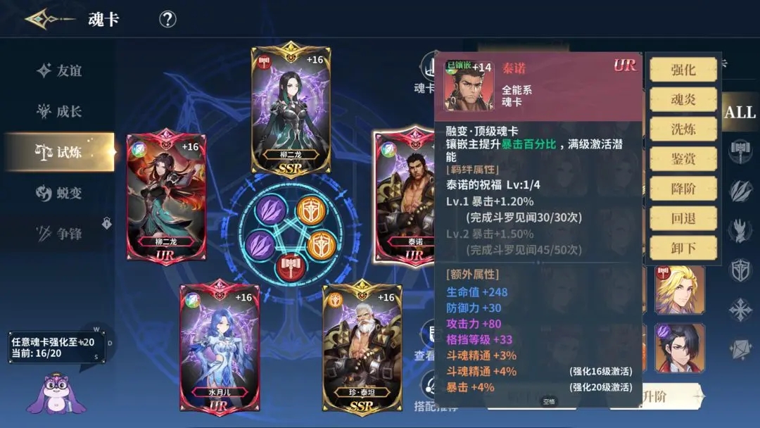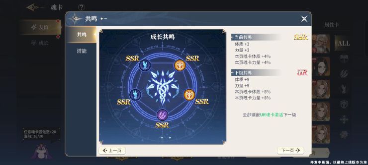 8、魂卡属性收益分为几个部分:强化等级收益、羁绊属性收益、红卡魂焱属性收益、套装激活属性提升收益,以及红卡特殊UR效果收益(强化20激活)。