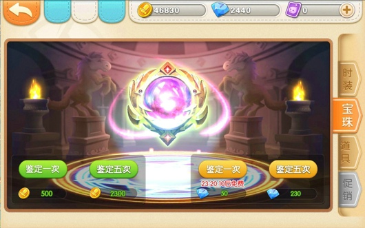 直接在商城的“宝珠”界面下鉴定宝珠,宝珠鉴定可以分为“钻石鉴定”和“金币鉴定”,二者效果相同。如果想一次性获取大量宝珠,可以点击“鉴定五次”,这样还会有一定的优惠。每隔24小时系统会赠送给我们一次免费鉴定宝珠的机会,大家不要忘了及时领取福利。