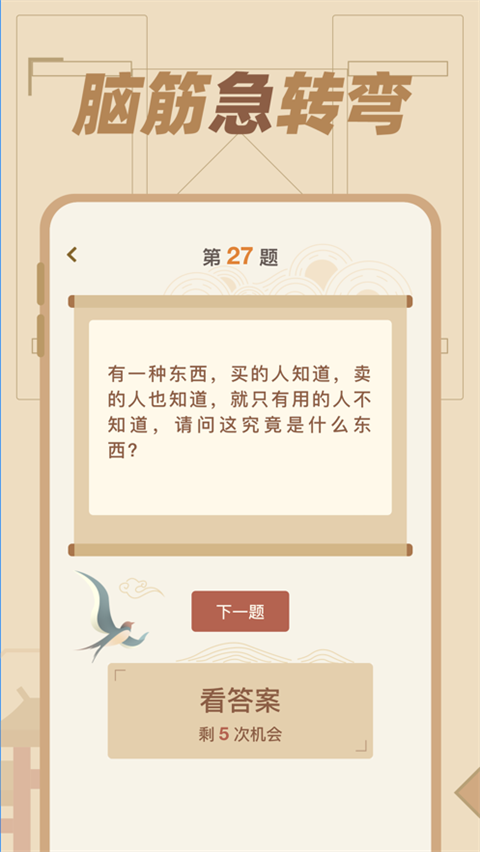 1、数千种不同的谜题将会让玩家的大脑得到丰富,同时提升大家的智慧。 2、每一道题是非常的特别,往往答案是非常的出乎你的意料之外哦。 3、你可以只用求助或者只提示的方式,来帮助你寻找正确的答案。更新日志