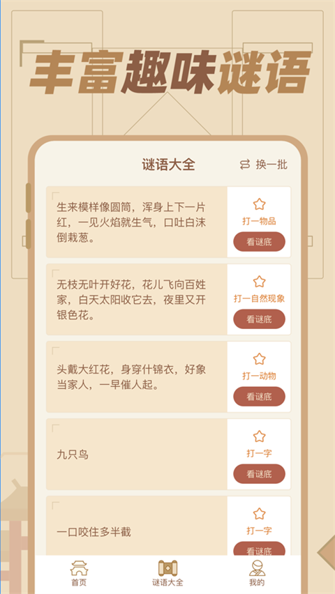 1、每一道题目都需要你仔细的来思考才能够最终寻找到正确的答案。 2、加成语、俗语、灯谜等不同的猜题加入,将会更加丰富大家的猜题乐趣。 3、其中所包含的哲理需要你来思考,往往能够让你得到全新的启发。游戏优势