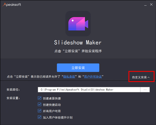 2、点击“自定义安装”,可以查看安装的位置和其他设置,不需要更改的话,直接点击“立即安装”即可;