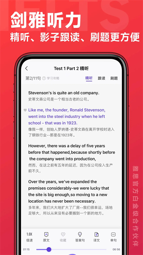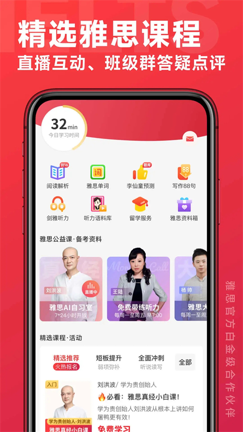 1、直播课堂 早上有“雅思早听早过”陪你练听力,晚上“雅思大神公益课”听最好的雅思老师讲课。 2、口语预测 雅思最新口语话题预测及题库;雅思考试的真实回忆,学生们再也不用去蹲题啦。 3、单词掌贵 贵学真经理论独创的单词记忆法,有阅读考点词、听力考点词、口语亮点词汇、写作词汇搭配;还有单词游戏,能边玩边背单词。 4、雅思语料库 雅思王经典应试策略,覆盖最近的考点回忆。 5、真题解析 真题解析,深刻揭露考生不知不觉被扣分的细微陷阱。 6、名师互动 雅思考试提分必备,名师们指导你如何打有准备的仗。软件亮点