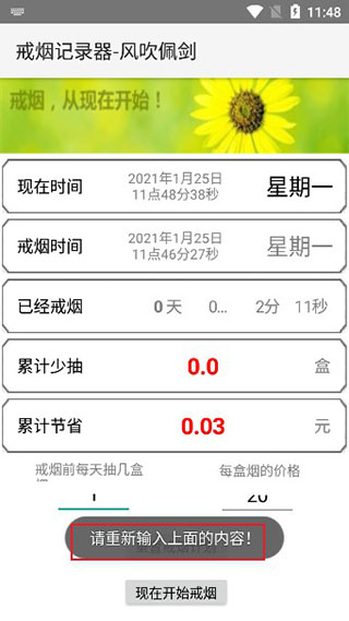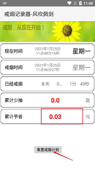 4、如果没忍住抽了烟,那么需要重置戒烟计划,并重新输入内容开始。