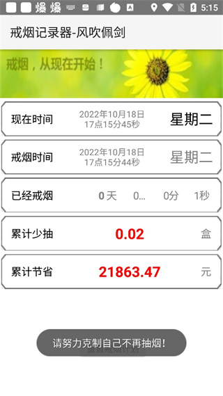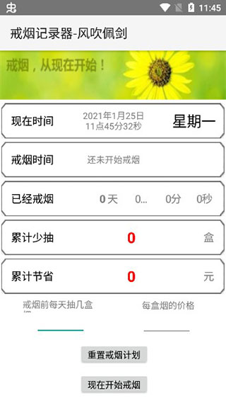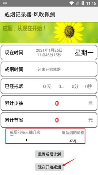 2、首先输入戒烟前每天抽几盒,以及每盒烟的价钱,点击现在开始;