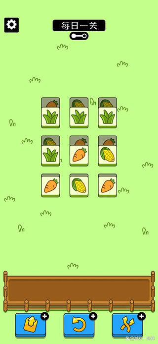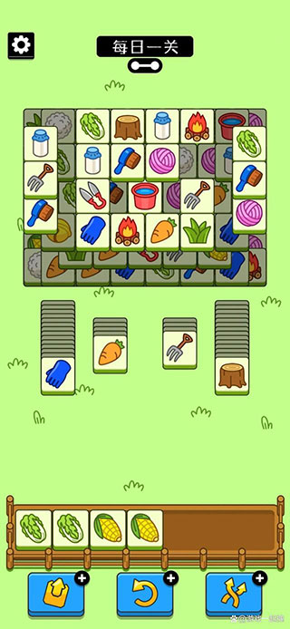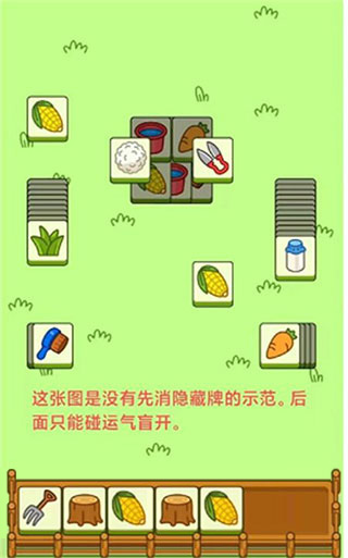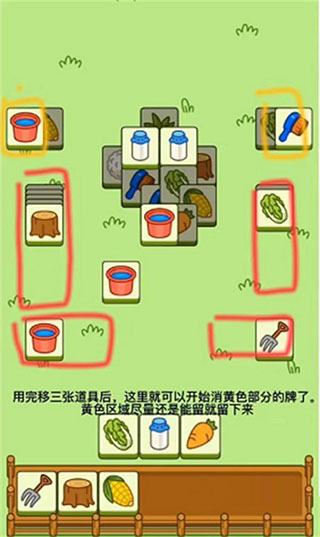4、下图所示黄色三角形这两张底部的牌先留着不要消。也就是水桶和玉米这两张牌。