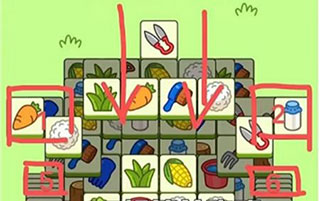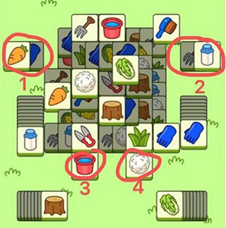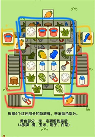 3、下图根据4个红色部分的隐藏牌,来消蓝色部分分。黄色部分一定一定要留到最后,一共4张牌,桶,玉米,刷子,白菜。