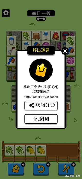4、除了洗牌道具之外,移出道具也是非常不错的一个选择,可以将操作栏三个图标直接放在上面,一定程度上也能对游戏的难度有所降低,这个道具更加偏辅助类,使用的时候还是要对牌面有一定的观察之后在决定是否使用。