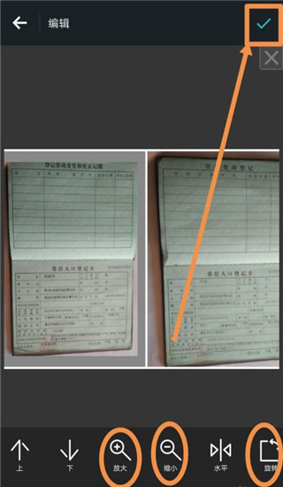 9、通过选中图片,点按界面下方的放大、缩小,可以改变图片显示大小,通过点按旋转,可以将不正的图片变正。