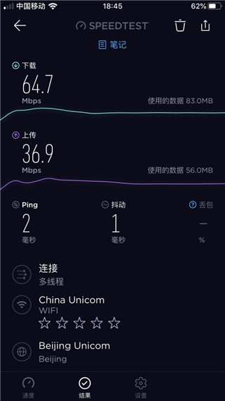 2、测试结果主要为3项:Ping 值,下载速度和上传速度;