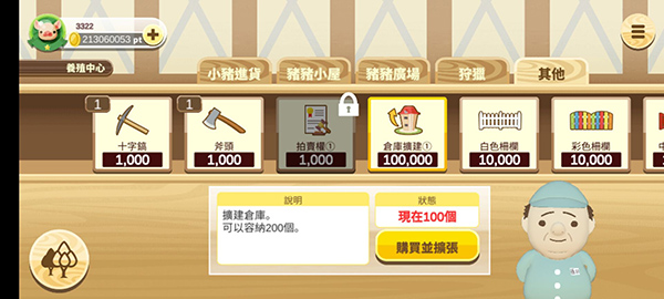 1、欢乐养猪,简单合成 合成情侣猪,合成分红猪,娱乐放松从养猪开始。在猪猪世界,你可以通过简单的合成,体会到快乐。 2、玩法丰富,多彩图鉴 各种各样的功能等你开发,丰富多彩的玩法等你体验,你可以孕育可爱的小猪,开拓你的猪猪图鉴,感受到愉悦。 3、丰富的养成道具! 自动打扫便便的「便便扫除机」,不容易生病的「空调」,配种後让小猪能早点出生的「母猪用地板」,狩猎时让小猪速度变慢的「慢悠悠蜗牛」等有非常多有用的道具,熟练之後,就可以使用这些丰富的道具更有效率地养猪罗。 4、和全国场主竞争! 可以和全国的养猪场主竞争。最会赚钱的场主是?出货最多的场主是?最会养猪的场主是?这些让人好奇的场主都可以在排行榜看到。你有办法成为最厉害的场主吗!? 5、猪猪图监 养成的猪猪会记录在「猪猪图监」。猪的特徵以及养成方法都会详细记载在上面。图监共6卷,利用小猪颜色清楚区分种类。图监里也可以确认系统图,对配种很有帮助。你有办法收集全部图监吗!?游戏玩法