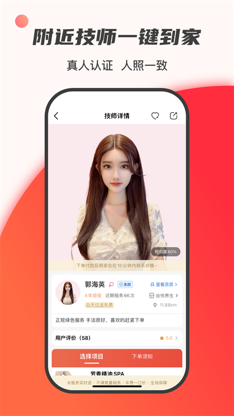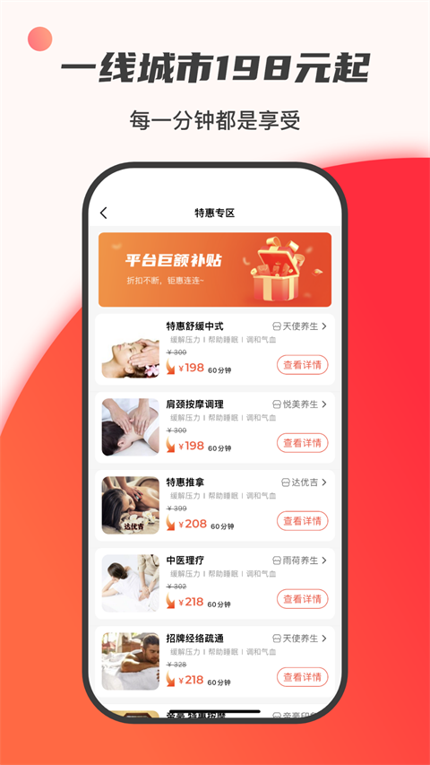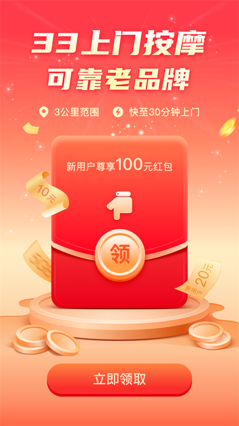 【上门按摩】 中医推拿/油压SPA/足疗保健,汇聚上门按摩、SPA、推拿、中医等品类,为用户提供高价值高标准的养生健康、保健的体验,并且您提供专业、正规、安全、便捷的24小时上门推拿服务,健康到位。 【开通城市】 北京、上海、广州、杭州、i深圳、成都、东莞、重庆、长沙、武汉、苏州、西安、贵阳等。 【产品特点】 医师级团队:综合中医、肌肉、推拿学等提供最专业按摩! 便捷的预约:公众号、客户端均可约,两小时内上门服务! 放心的品牌:打破传统门店上门按摩高价! 【服务简介】 上门按摩:经络为基础,中医按摩使经络畅通,保持健康状态! 康复治疗:通过抗阻力,根据功能障碍,康复治疗中风瘫痪等! 足疗/SPA:足疗保健改善内分泌血液循环;SPA促进新陈代谢! 【开通品类】 上门按摩、推拿、点到,足疗保健、康复理疗、精油SPA、催乳、艾灸调理、刮痧、采耳等中医上门服务。更新日志