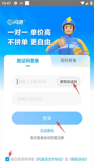 1、点击“获取验证码”,勾选屏幕最下方的“我已阅读...”,随后点击“登录”。