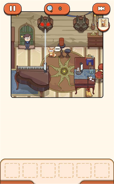 1、点击两面棱镜使其转动(第二面棱镜转动需要先点击头骨将其移开),将红光折射到右边的狐狸雕塑